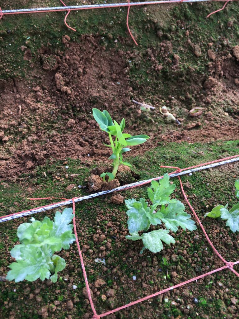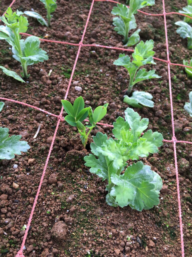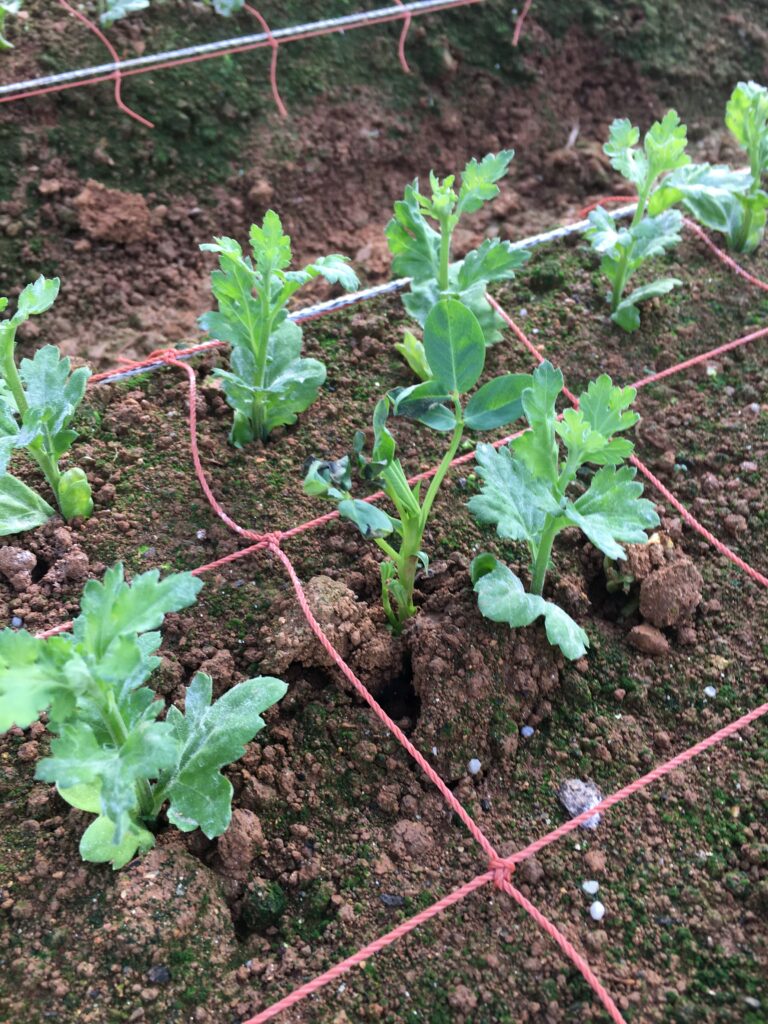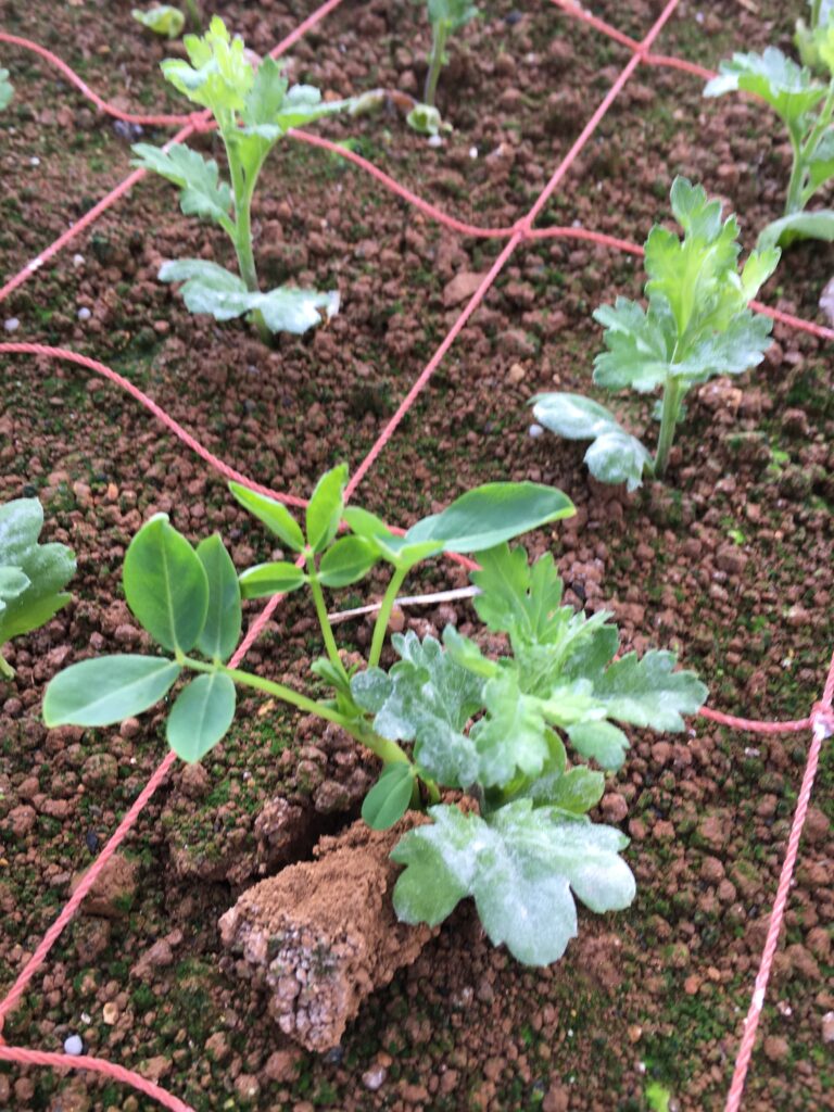べたがけビニールフィルムを取り外した直後は、ちょっと弱々しいスプレーマムの苗でしたが、一晩たったらシャンとしてきました。